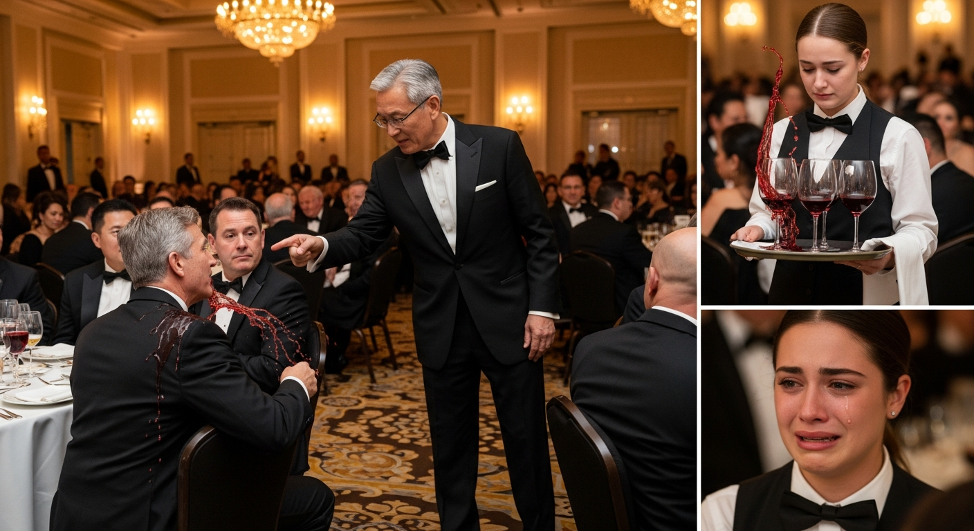Red wine arced through the air like a crimson wave. It splashed directly across a man’s chest—his black tuxedo jacket, his crisp white shirt, his diamond cufflinks.